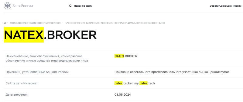 Если говорить о деятельности NATex на территории Российской Федерации, то работает лжеброкер также вне правового поля. Более того, Центральный банк – главный регулятор страны, еще в июне 2024 года включил проект в список организаций с признаками нелегального участника рынка ценных бумаг. Факт мошенничества проекта на «лицо» и оспаривать его нет ни малейшего смысла.