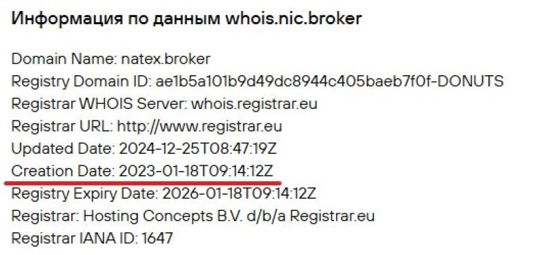 Проверка возраста домена natex.broker показала, что в работу он был запущен в январе 2023 года. Выйти на столь внушительные показатели за такой короткий период практически нереально. Аферисты умышленно приукрашивают свои достижения, чтобы выглядеть перед трейдерами солидной и внушающей доверия конторой.