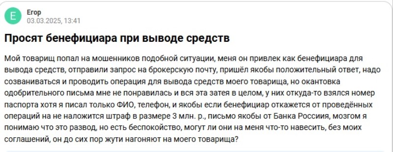 Одна из распространенных схем — вовлечение так называемого бенефициара для «разблокировки» средств. Мошенники утверждают, что вывести деньги можно только через доверенное лицо, которому нужно подтвердить операцию, пройти верификацию и якобы одобрить транзакцию. Все выглядит официально — вплоть до «письма от банка» и угрозы штрафов. Но в реальности это очередная ловушка. Вот реальная история, в которой жертву попытались запугать через подставного бенефициара: