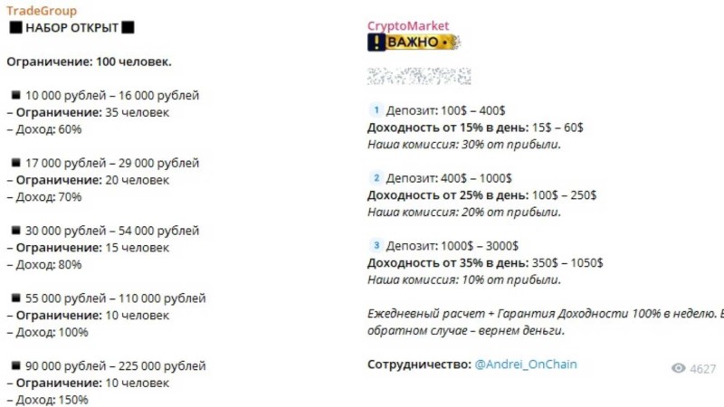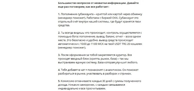 Чтобы вызвать интерес, упоминается «торговля от имени клиента» и «прямая связка с биржей». Все подано так, будто идет реальный процесс, а новому участнику просто нужно довериться и сделать первый шаг — отправить криптовалюту на предложенный адрес.