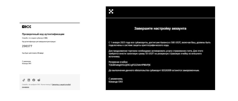 После перевода первой суммы пользователь получает письмо, которое выглядит как официальное сообщение от OKX, Binance или Bybit. Там сообщается, что открыт «субсчет» и необходимо подтвердить его через код.