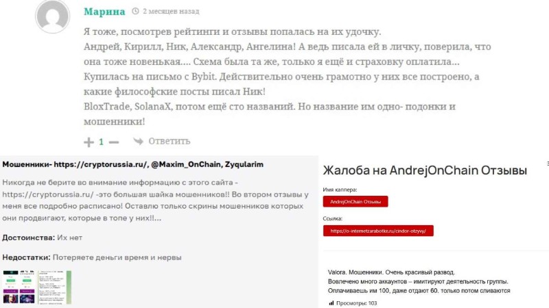 У сайтов вроде cryptorussia.ru и investment-otzivy.ru общий стиль — фейковые рейтинги и шаблонные комментарии. Под статьями — однотипные диалоги с «успешными историями», благодарностями и советами «попробовать». Это главный триггер: пользователь попадает в ловушку видимого доверия и переходит по ссылке в Telegram.