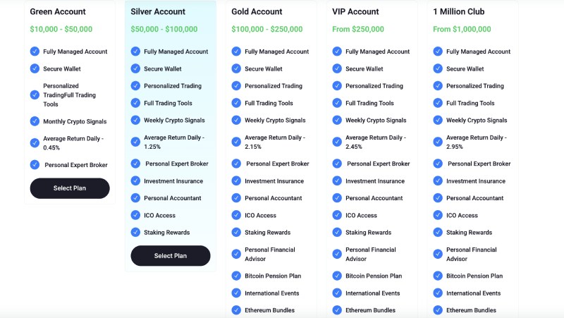 Также на презентационной платформе описывается 5 типов тарифных планов с разбросом стартового депозита от $10 000 до $1 000 000 и дополнительными торговыми условиями. Последние определяются дороговизной тарифа.