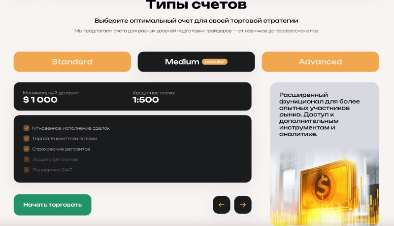 Средний — от 1000 у.е., с левериджем 1:500;