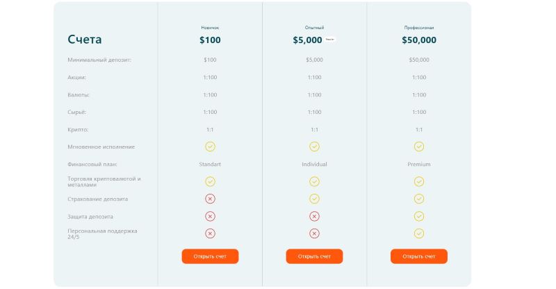 На выбор клиентам доступно три тарифных плана с депозитами 100$, 5 000$ и 50 000$. Специалисты scaud.info обращают внимание на некоторые особенности торговых условий: