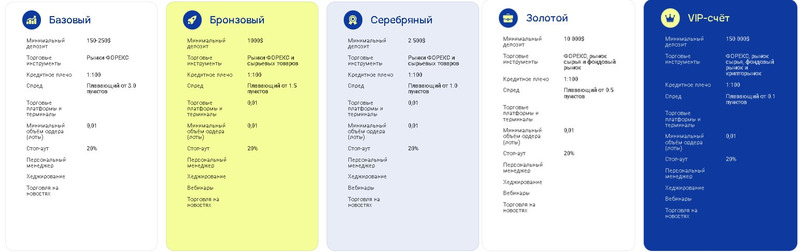 Базовый, где минимальное пополнение от 150 до 250 USD, спреды от 3 пунктов, кредитное плечо 1:100, стоп-аут 20%.