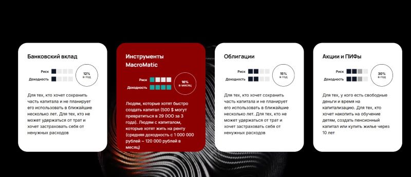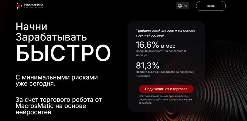 Инвестиционная компания MacrosMatic предлагает начать зарабатывать с минимальными рисками путем вложений в различные финансовые инструменты. Заработок осуществляется с помощью торгового робота, который основан на трейдинговом алгоритме. По словам разработчиков проекта, за последние 8 месяцев он показал доходность 16,6% в месяц.