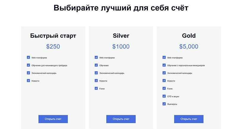 Предлагалось шесть категорий торговых счетов — от «Быстрый старт» до «VIP». Условия отличались по объему предоставляемых функций, от базовых инструментов до якобы глубокой аналитики и онлайн-сопровождения.