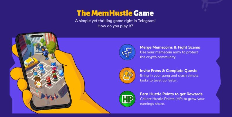 Игровое мини-приложение MemHustle в мессенджере Telegram, которое разработано на базе блокчейна TON. Разработчики проекта советуют не путать его с классическими играми тапалками. Они утверждают, что создали уникальную игровую платформу, которая оснащена различными инструментами и полезными возможностями. Потенциальным игрокам предлагают объединять персонажей Memecoins, бороться с мошенничеством и получать за это награды.