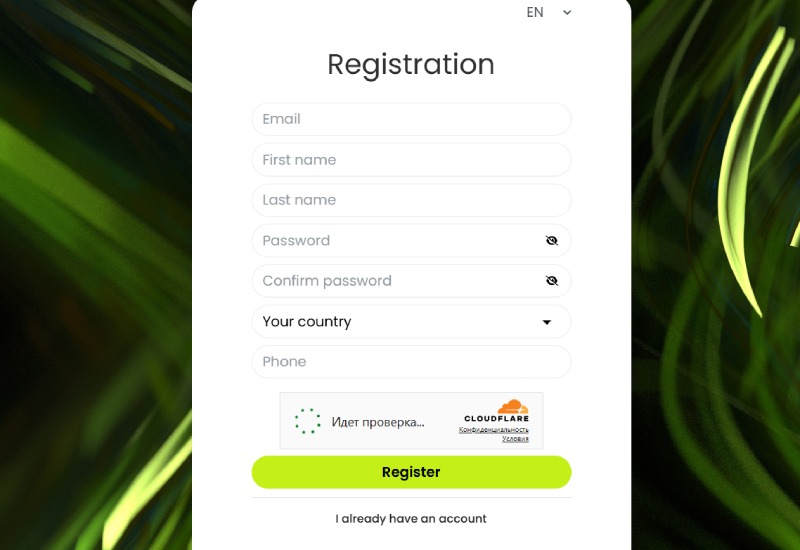 Изучить условия сотрудничества можно после создания учетной записи. Регистрационное поле стандартное, нюансы в виде партнерской ссылки или проверочного кода отсутствуют. Чтобы стать клиентом компании, нужно: