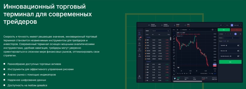 Финансовый посредник обещает возможность торговли различными активами. Эксперты Scaud заметили, что на сайте отсутствует информация о тарифных планах. Сообщается о быстрой обработке ордеров, торговле с кредитным плечом до 1:20, прозрачности операций и широком выборе инструментов на одной платформе. При этом минимальная сумма депозита не объявлена. Программное обеспечение, используемое для торговли, не имеет общедоступного названия и называется «нашим терминалом», что может указывать на собственную торговую площадку, однако однозначно утверждать не следует. Терминал якобы обладает удобной навигацией, инструментами для анализа рынка и доступен на различных устройствах. Программа поддерживает работу со следующими финансовыми инструментами: