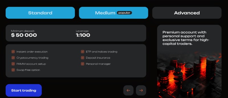 Медиум — от 25 000 у.е. с левериджем 1:50;