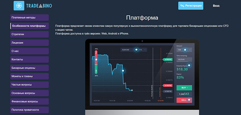 Компания под названием Trade Bino рассказывает о себя как брокере бинарных опционов, предлагая своим клиентам якобы широкий спектр услуг в этой области. Презентационный сайт посредника переведен на русский язык, что может быть удобно для локальной аудитории.