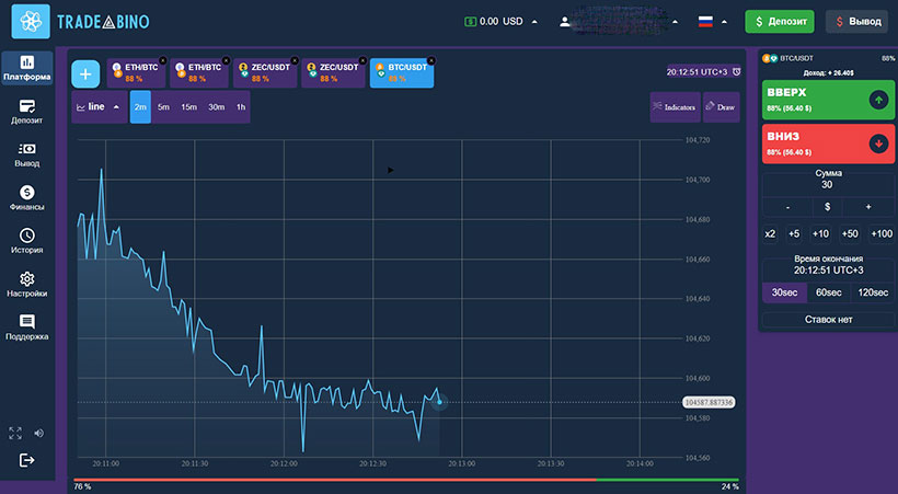 Брокер бинарных опционов «Трейд Бино» не использует традиционные тарифные планы, предлагая вместо этого якобы уникальную торговую стратегию. Как заявляет посредник, эта стратегия универсальная и с таймфреймами от 60 до 300 минут. Также она должна быть ориентирована на работу с: