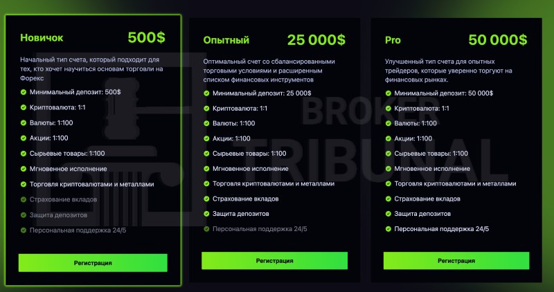 На сайте брокера представлены три тарифных пакета: Новичок, Опытный и Про.