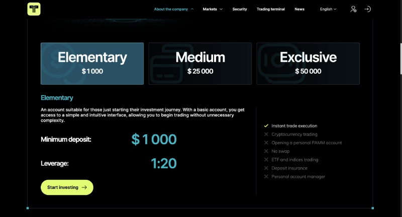Премиум-тариф активируется при внесении от 50 000 USD. Его владельцам обещают индивидуальное сопровождение 24/7, эксклюзивные функции и максимальное кредитное плечо — 1:100.