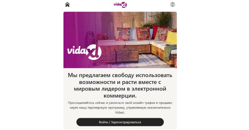 Инвестиционный проект Vidaxl Za презентует себя в роли мирового лидера в сфере электронной коммерции. Всем желающим он предлагает зарабатывать на перепродаже товаров, а также возможность увеличения онлайн-трафика и продаж с помощью партнерской программы.