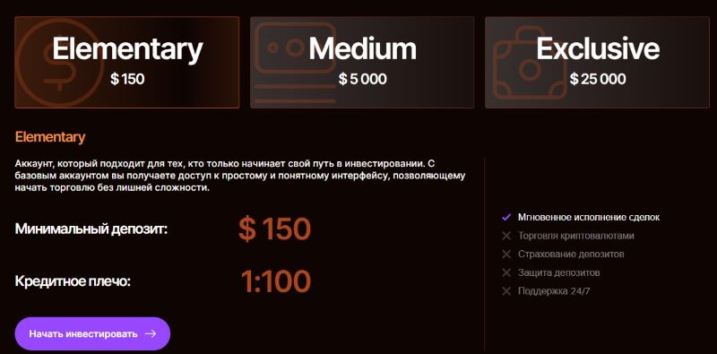 На выбор трейдерам предложено несколько торговых счетов с начальными депозитами 150$, 5 000$ и 25 000$. Эксперты scaud.info отмечают, что посредник предлагает достаточно высокие показатели кредитного плеча — 1:500. Финансовые регуляторы установили лимит на леверидж, который не должен превышать показателей 1:50. Также нужно обратить внимание на ограниченность начальных тарифов и отсутствие информации о комиссиях, свопах, спредах. О наличии демонстрационного аккаунта для тренировочного трейдинга брокер умалчивает.
