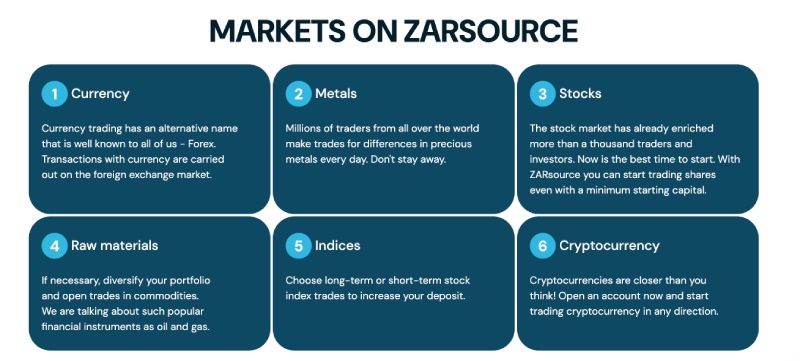 Посредник ZARsource утверждает, что использует современные технологии, предлагает аналитическую поддержку и различные сервисы, созданные для облегчения принятия торговых решений независимо от выбранных активов. Эти возможности должны быть доступны благодаря механике авторского терминала. Однако на сайте отсутствует информация о программном обеспечении, о доступных функциях для торговли с мобильных устройств или через другие платформы.